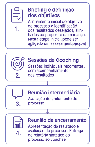 Uma oportunidade de analisar pontos individuais e aumentar a autoconfiança e autoeficácia. Para isso, o processo é composto por etapas de autoconhecimento e desenvolvimento com um conjunto de técnicas e ferramentas para tirar o coachee (participante) de seu estado atual e levá-lo ao estado desejado de forma mais rápida que for possível e satisfatória.